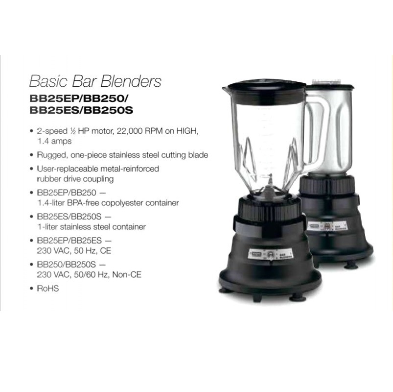 The Waring BB250P, bar blender with 2-speed, toggle-switch control and 44-oz. copolyester container is perfect for light beverage prep, such as frozen drinks, margaritas and more. Keep your beverage patrons happy Product Information :